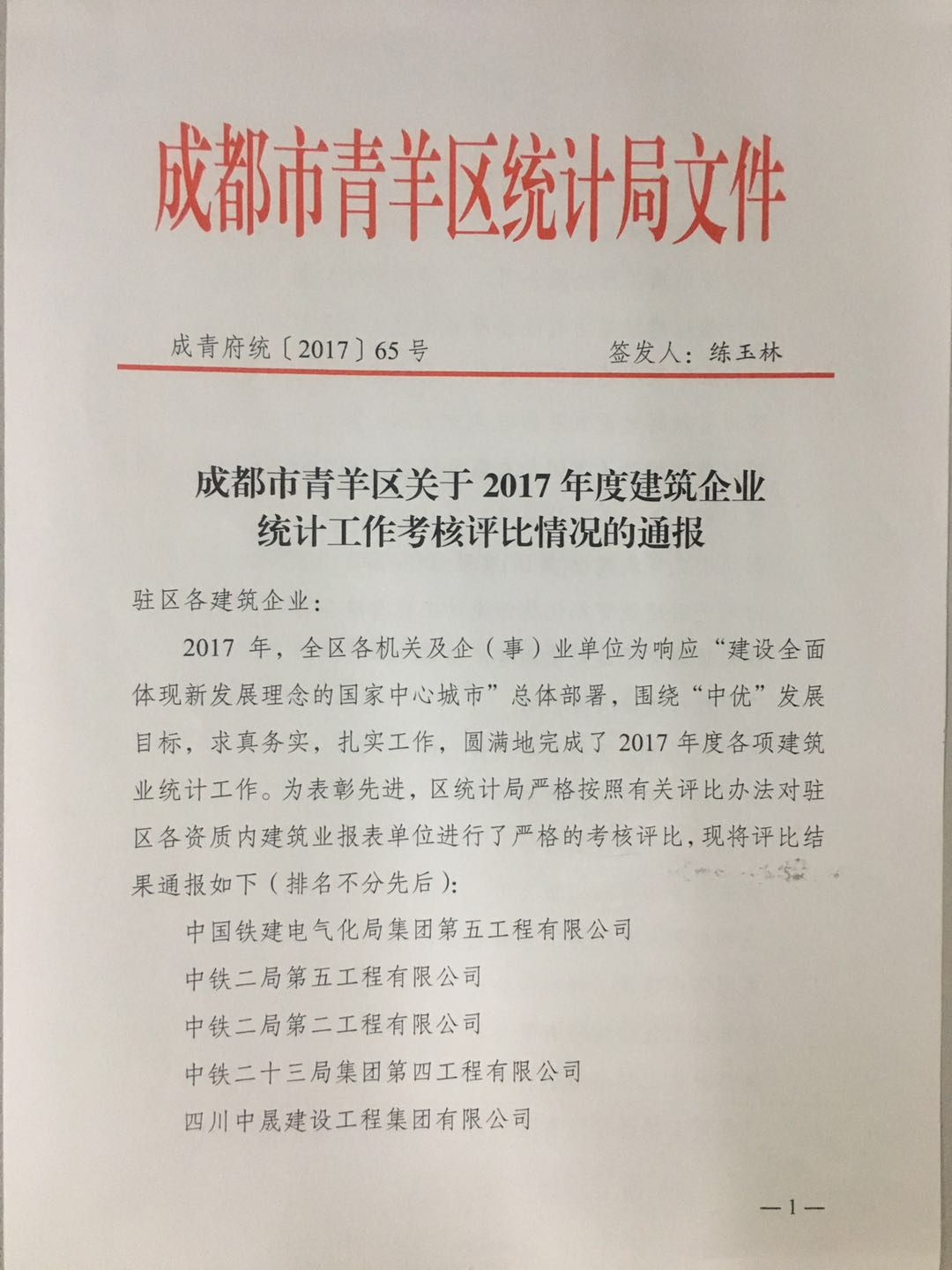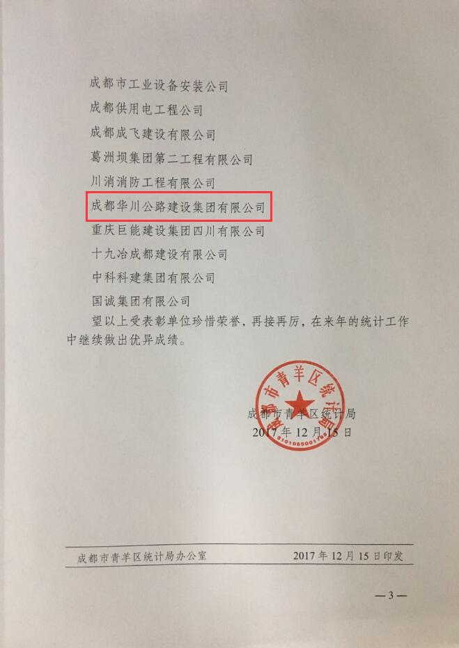 1月24日上午,青羊區(qū)統(tǒng)計局組織召開2017年建設(shè)領(lǐng)域統(tǒng)計工作年報會,對全區(qū)36家2017年度統(tǒng)計工作怎么怎么的完成較好的單位建筑企業(yè)進行了通報表彰,集團公司及集團子公司華川集團及華途公司均被評為先進榮獲青羊區(qū)建筑業(yè)統(tǒng)計工作先進單位。