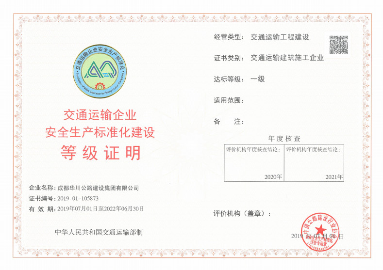 按照集團(tuán)公司統(tǒng)一部署,于2018年10月啟動達(dá)標(biāo)創(chuàng)建工作。通過公司自查、備考、評價(jià)、驗(yàn)收階段,穩(wěn)步推進(jìn)標(biāo)準(zhǔn)化達(dá)標(biāo)的各項(xiàng)工作開展。2019年4月9日-11日,交通運(yùn)輸部達(dá)標(biāo)評審專家組對集團(tuán)公司進(jìn)行一級達(dá)標(biāo)驗(yàn)收,對集團(tuán)安全生產(chǎn)標(biāo)準(zhǔn)化工作給予充分肯定。最終,集團(tuán)公司順利通過交通運(yùn)輸建筑施工企業(yè)安全生產(chǎn)標(biāo)準(zhǔn)化達(dá)標(biāo)認(rèn)證考核。