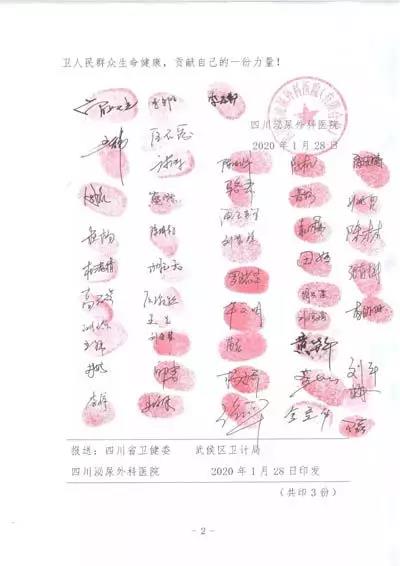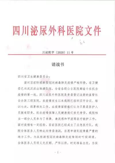 1月28日集團旗下四川省泌尿外科醫(yī)院黨政工群各級領導干部、防控應急醫(yī)療隊和醫(yī)院技術骨干100余人召開請戰(zhàn)大會,主動向省衛(wèi)健委請戰(zhàn)馳援武漢,請戰(zhàn)書已于當日送達,省衛(wèi)健委對醫(yī)護人員積極抗擊疫情給予肯定贊揚,并指示爭取第三批次派遣醫(yī)護人員前往疫區(qū)第一線。1月31日起,該院根據省中醫(yī)管理局公布的冬春季呼吸道傳染病預防建議處方,緊急熬制中藥湯劑,免費向市民發(fā)放,每天限量供應1000人份(6000袋)。
