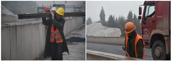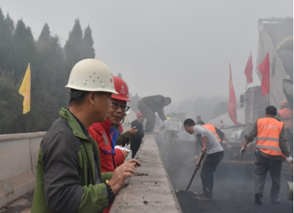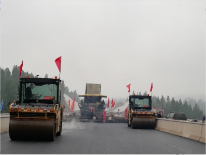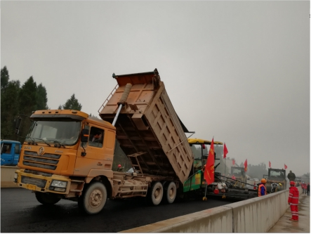 觀施工現(xiàn)場,華川旗幟高高飄揚,迎著微風,伴著小雨,1臺攤鋪機、5臺壓路機、15臺運輸車相互密切配合,攤鋪、碾壓機器發(fā)出的聲響,奏出了一曲鏗鏘有力的“施工進行曲”。現(xiàn)場負責人及時查看攤鋪厚度,確保厚度在合理范圍內(nèi),技術(shù)員實時查看瀝青攤鋪溫度,項目部領導駐現(xiàn)場指導,經(jīng)過各級人員的共同努力,精心組織、標準化,文明化施工,攜手完成了本次試驗段鋪筑工作。
