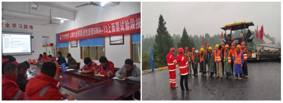 本次試驗段鋪筑在K48+570-K48+940,全長370m。為了成功完成試驗段鋪筑工作,項目部精心組織,科學籌劃,專門成立試驗段鋪筑管理小組,細化施工方案,明確人員分工。提前召開施工技術(shù)交底會,班前安全教育,從攤鋪、碾壓、運輸車輛運輸、施工溫度控制、人員組織等各個方面詳細交代,確保試驗段一次性成功鋪筑。